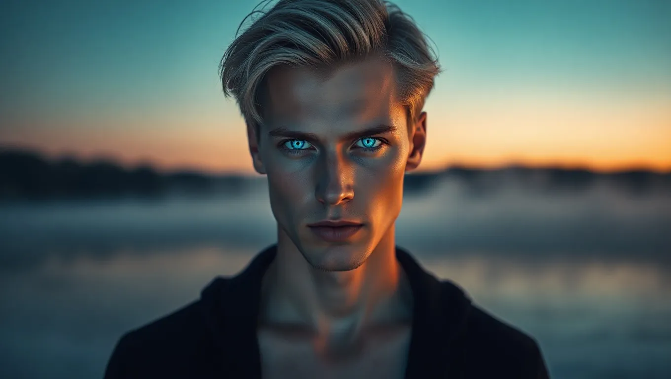 Imagine standing at the edge of a shimmering lake under a twilight sky, when suddenly a figure emerges from the mist—a blonde man with piercing electric blue eyes that seem to glow with an otherworldly intensity.
