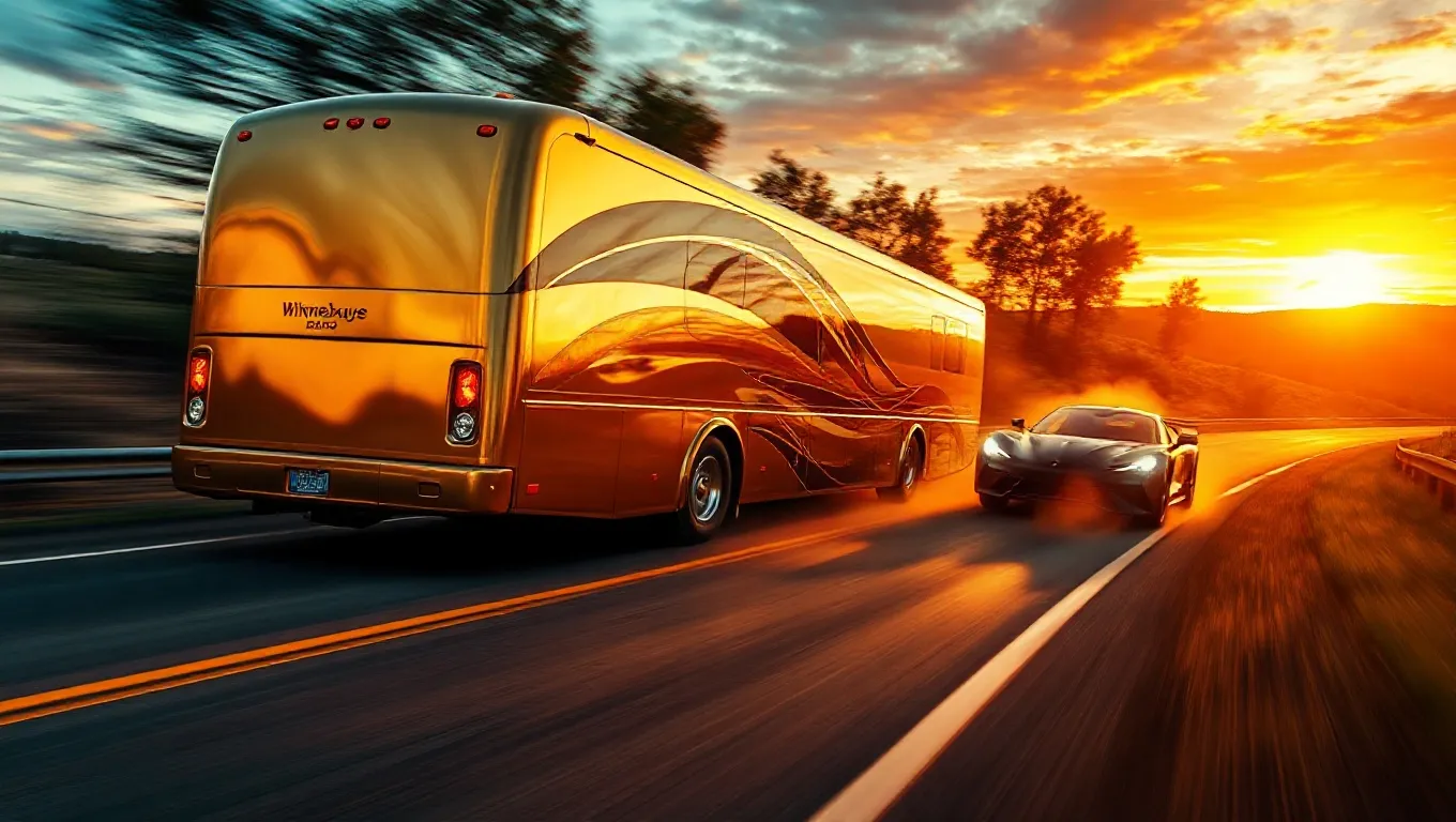 Overall, the big gold Winnebago racing another vehicle highlights a dynamic phase where ambition meets competition, urging you to balance your pursuit of success with maintaining your own pace and direction.