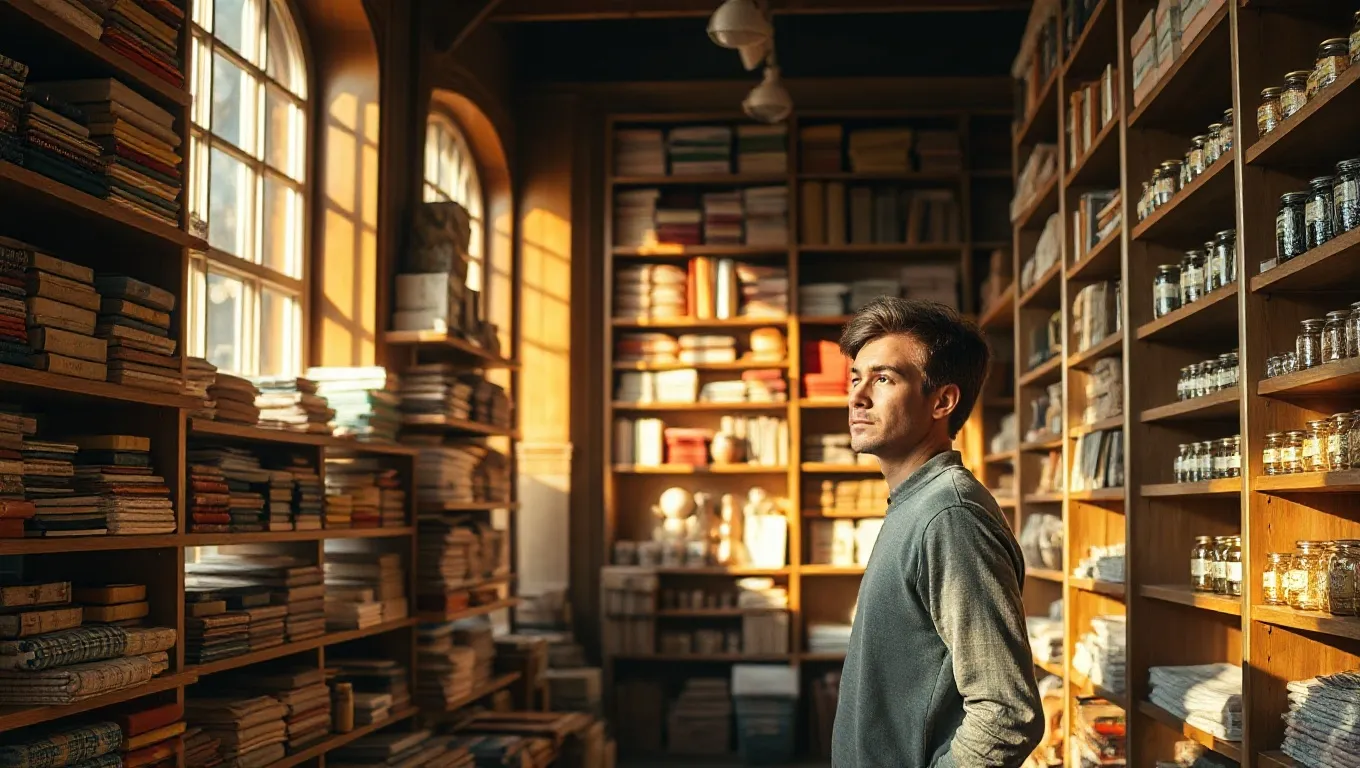 When you see such a shop, it suggests that you are consciously or unconsciously acknowledging the wealth of experiences you have gathered and how they contribute to your development. The neatly arranged stacks indicate organization and order in processing these experiences, while a chaotic pile might point to unresolved lessons or the need to sort through your past to move forward.